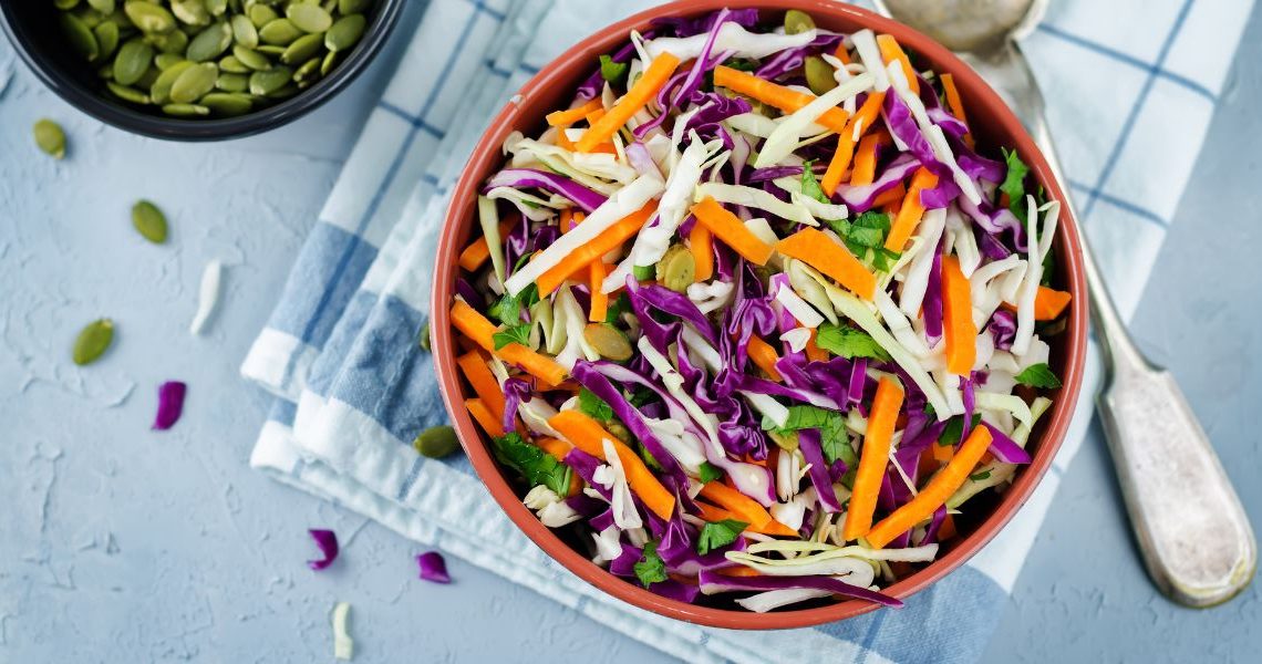 Σ’ ένα μπολ αναμίξτε τα καρότα, το μωβ και το λευκό λάχανο, εφόσον τα έχετε ψιλοκόψει προηγουμένως. Ρίξτε το ελαιόλαδο και το μηλόξυδο και ανακατέψτε καλά. Τέλος προσθέστε τα καρύδια, τους κολοκυθόσπορους, τις φέτες του μήλου, το αλάτι και το πιπέρι.